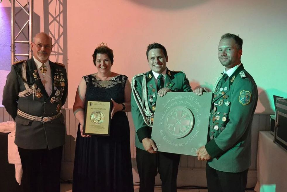 Bürgermeister Dr. Gero Karthaus, gleichzeitig Schirmherr der Veranstaltung, überreichte die Ehrenplakette des Landes Nordrhein – Westfalen. Von Bezirksbundesmeister Ernst-Guido Janßen erhielt die Bruderschaft vom Bezirksverband Sülztal eine speziell angefertigte Grauwacketafel zur Erinnerung an das Jubiläum und bedankte sich gleichzeitig für die hervorragende Arbeit der Bruderschaft. Weiterhin hatte Janßen die Hochmeisterplakette im Gepäck, die er im Auftrag des Bundes der Historischen Deutschen Schützenbruderschaften überreichte.